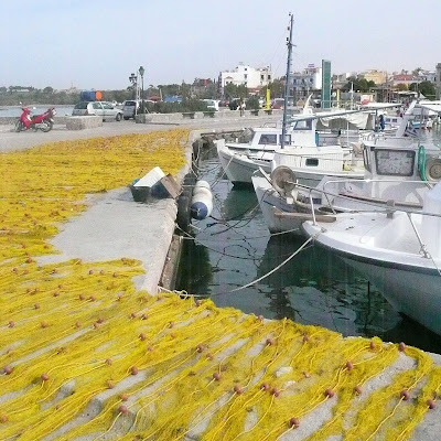 Fishing boats and fishing nets along the harbour.